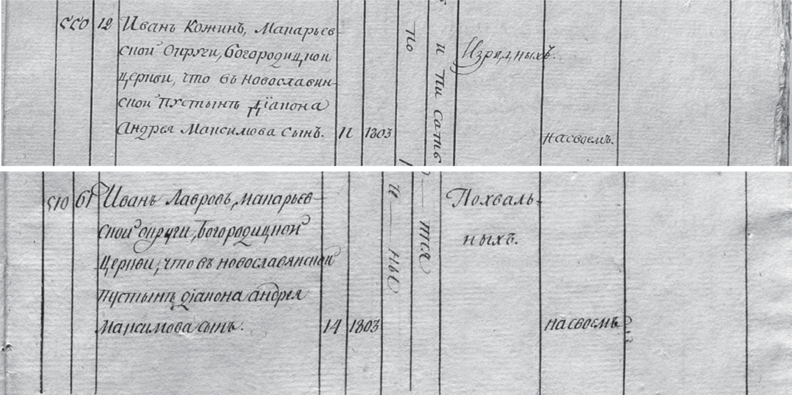 Что же касается предков Ивана Кожина-Лаврова и Александра Кожина, т. е. их отца, диакона Богородицкой церкви, что в Новославинской пустыни, Андрея Максимова и их деда, священника той же церкви Максима Стефанова, то они в ревизских сказках на рубеже XVIII и XIX веков числятся бесфамильными[24]. Это, однако, не значит, что у них не было родового имени. С высокой вероятностью они тоже звались Кожиными, а произошла эта фамилия скорее всего от прозвища их предка, которого предположительно звали Кожа. (Возможно, он занимался выделкой кож для обуви, одежды, церковных книг или дал другой повод для соответствующего прозвища.) Пролить свет на «бесфамильный период» истории рода поможет дальнейшее изучение архивных документов начала – середины XVIII века.