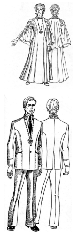Сценарий обряда торжественной регистрации брака. Авторы книги отмечают, что лица, которые проводят обряды, должны быть одеты в специальные обрядовые современные костюмы, основным элементам кроя которых свойственны черты народной одежды. В качестве основы женского костюма было избрано длинное платье с накидкой типа укороченного плаща, мужского — пиджак прямого кроя (рис. 1). Особенно обращает на себя внимание нагрудный знак исполнителя обряда на красивой массивной цепи (рис. 2). Что это, как не попытка создать психическую ассоциацию со священническим наперсным крестом? И вот перед новобрачными не просто совслужащий, а человек, наделенный каким-то «высшим даром».