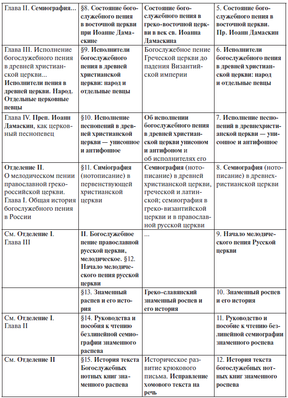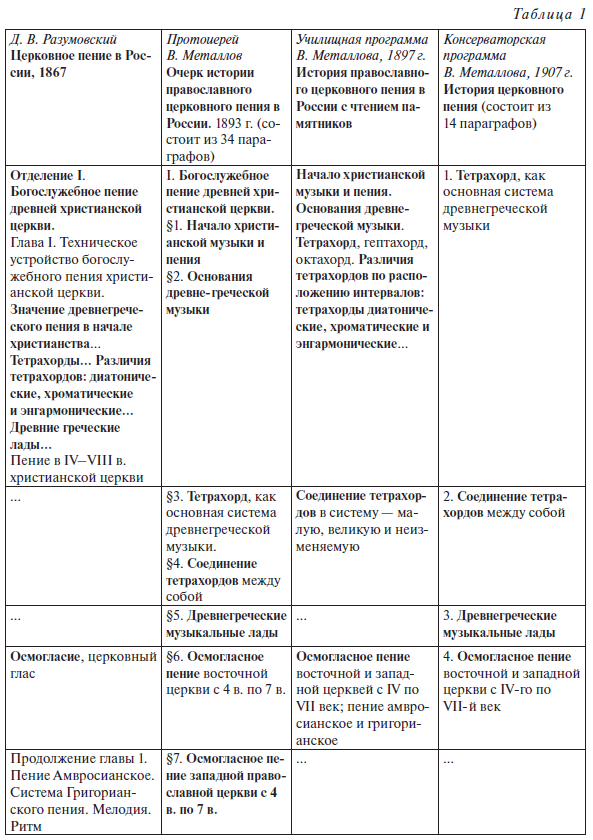 В архивах сохранились училищная программа «История православного церковного пения в России с чтением памятников», датированная 1897 г., и более поздняя консерваторская программа Металлова 1907 г. Из таблицы видно, что в них он ориентировался на труд Разумовского (в целом сохранен его тематический план, хотя некоторые темы переставлены) и собственный «Очерк», о котором речь шла выше (см. таблицу 1).