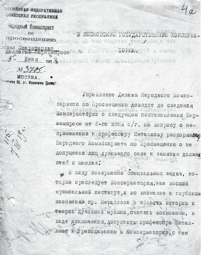 В послереволюционные годы положение профессуры в консерватории становится сложным, особенно это касается старейших ее сотрудников — соратников Н. Г. Рубинштейна. В бедственном материальном состоянии находится легендарная инспектриса консерватории, ученица Н. Г. Рубинштейна и П. И. Чайковского, уважаемая всеми Александра Ивановна Губерт[36], первый летописец консерватории профессор Николай Дмитриевич Кашкин, спасаясь от голода, вынужденно уезжает из Москвы в Казань. Постепенно исчезают педагогические и воспитательные традиции Московской консерватории[37], меняется ее учебный план. Продолжение педагогической деятельности профессора и протоиерея В. М. Металлова в консерватории и, соответственно, читаемого им кур��а истории церковного пения оказывается под угрозой.