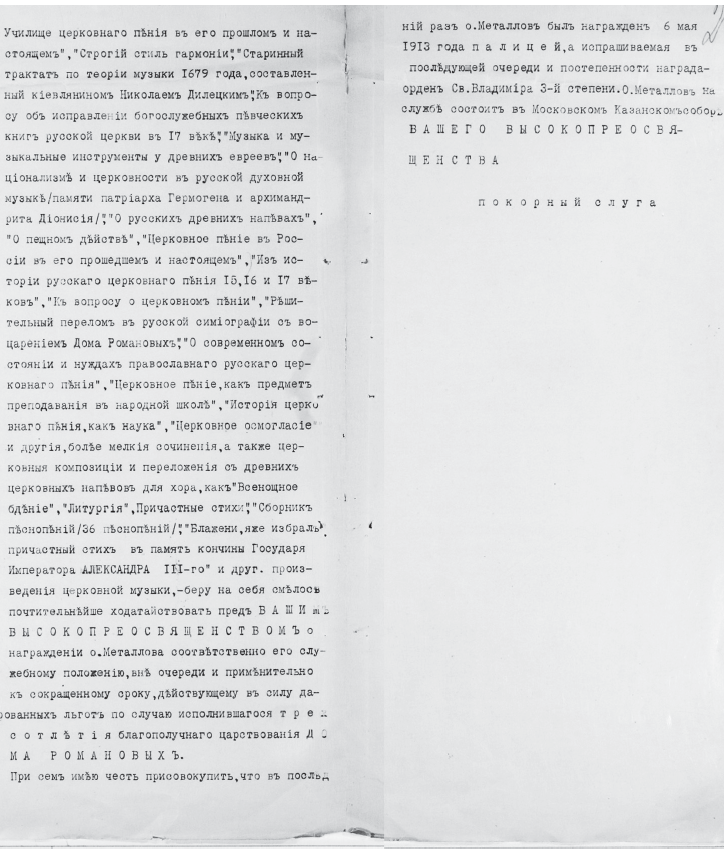 К «многоуважаемому отцу Протоиерею» он обратился сразу с несколькими просьбами: о том, чтобы тот принял его и его труды «под свое покровительство»; о содействии в получении диплома учителя пения или регента (вероятно, он рассчитывал на поступление в Синодальное училище церковного пения, как раз тогда открывшего подготовку регентов[3]), а также в получении разрешения на издание собственных переложений духовных песнопений. Для того чтобы познакомить Разумовского со своими «музыкальными опусами», один из них он присоединил к своему письму. Поскольку годом позже Металлов благодарил Разумовского за поддержку, можно сделать вывод, что тот каким-то образом смог разрешить его проблемы.