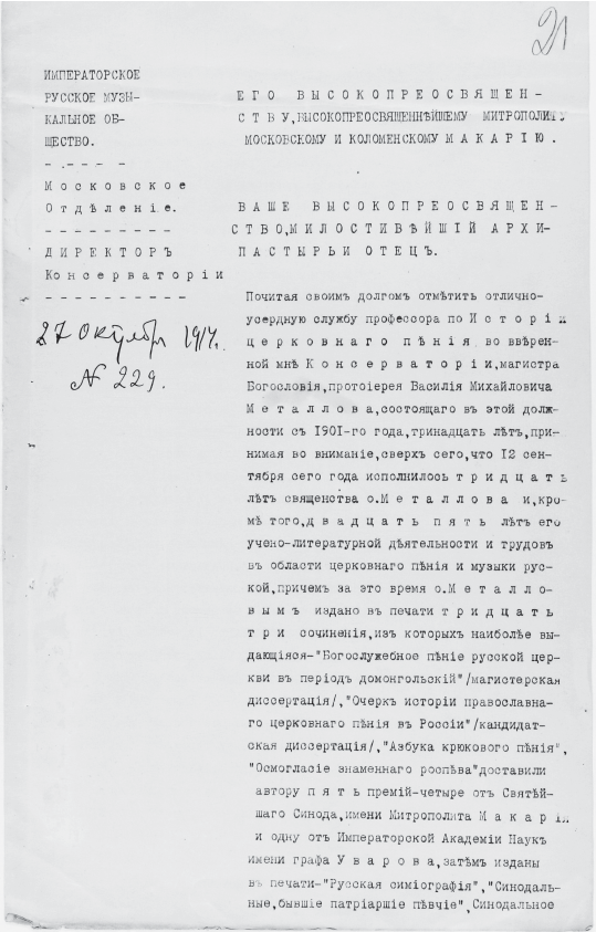 Ил. 1а. Ходатайство директора Московской консерватории М. М. Ипполитова-Иванова митрополиту Московскому и Коломенскому Макарию о награждении В. М. Металлова по случаю 300-летия царствования Дома Романовых.
