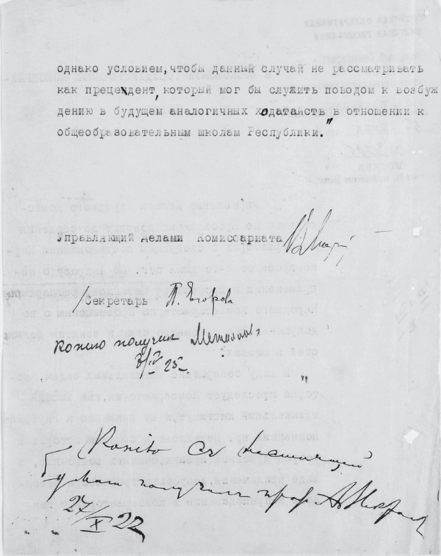 На документе, датированном 1919 г., имеются две расписки в получении его копий — от 1922 и 1925 г. (автограф Металлова), свидетельствующие о неоднократных попытках уволить профессора, но, по-видимому, предъявление данного разрешения не давало им осуществиться.