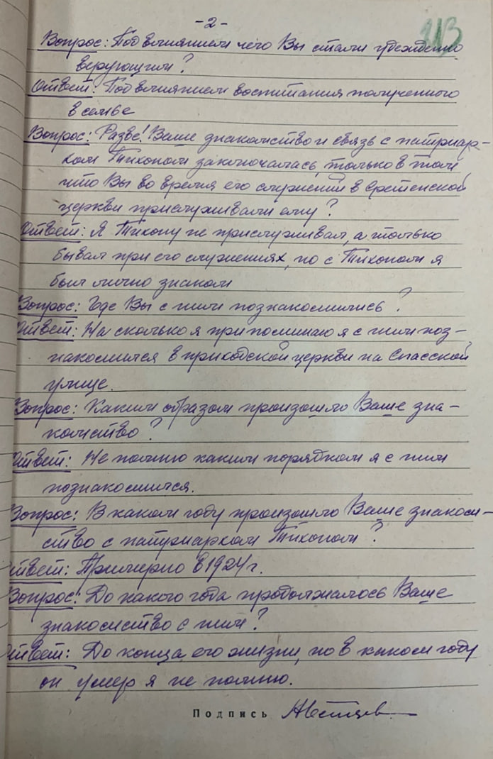 Вопрос: Ваш ответ, то есть отказ от показаний подтверждает, что Вы совместно с служителями священного культа проводили контрреволюционную агитацию, а теперь боитесь их выдать, дайте подробные показания на этот счет?