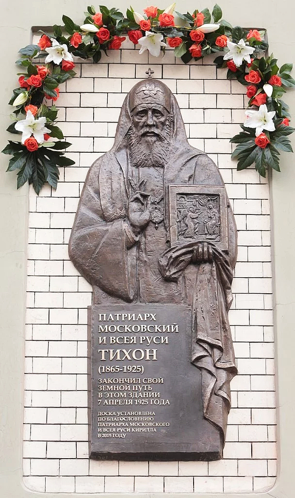 Спустя 90 лет со дня блаженной кончины патриарха Тихона, в праздник Благовещения, 7 апреля 2015 г., на доме по ул. Остоженка, 17–19, где прежде находилась клиника Бакуниных, в которой провел свои последние дни и минуты святой патриарх Тихон, по благословению Кирилла, Святейшего Патриарха Московского и всея Руси, была установлена и освящена мемориальная доска в память о святителе Тихоне, Патриархе Московском и всея России. (Илл. 15) На барельефе святитель изображен с иконой Благовещения Пресвятой Богородицы, принесенной из Зачатьевского ставропигиального монастыря сыном старосты Спасского храма с Большой Спасской Алексеем Александровичем Беляевым.
