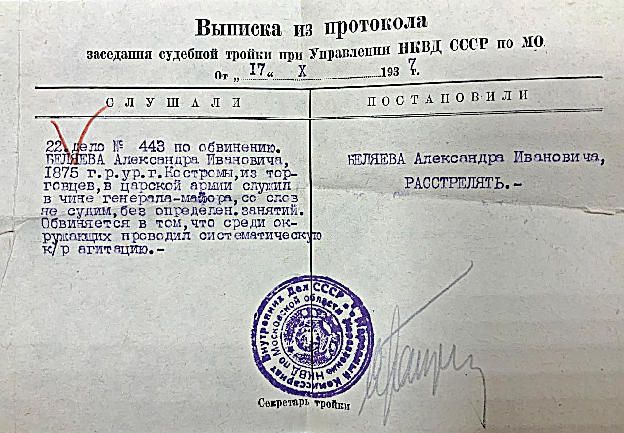 После 1938 г. началась «чистка» в органах НКВД, от граждан стали принимать заявления с просьбой о пересмотре дел ранее репрессированных. Семья Александра Ивановича, ничего не зная о его расстреле, решила использовать возможность что-то узнать о его судьбе. Обращение вдовы Александра Ивановича в марте 1940 г. в органы НКВД на имя Л. П. Берии для пересмотра дела генерала Беляева[65] и дальнейшее следствие в конечном итоге привели к аресту и тяжелым приговорам для всей семьи и родственников генерала: вдовы Ольги Ивановны Беляевой, сына Алексея Александровича Беляева, дочери Ольги Александровны Вердеревской (в девичестве Беляевой), ее супруга Анатолия Александровича Вердеревского и его сестры Марии Александровны Баевой[66].