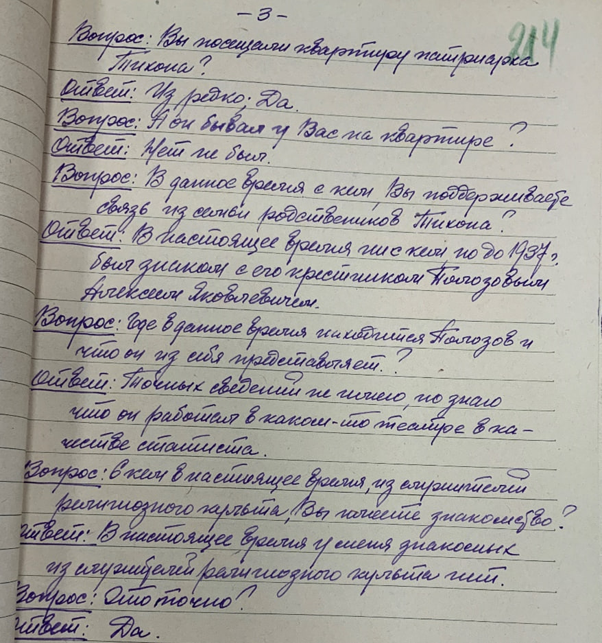 Ответ: Bо-первых, я не надеюсь на свою память, а во-вторых, я привлечен к ответственности и не хочу кого-либо из лиц священного культа вовлечь в подозрение, а поэтому и отказываюсь их назвать.