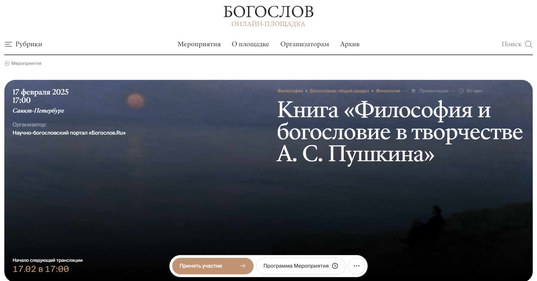 17 февраля — презентация книги протодиакона В. Василика и Ю. Руденко «Философия и богословие в творчестве А.С. Пушкина»;
