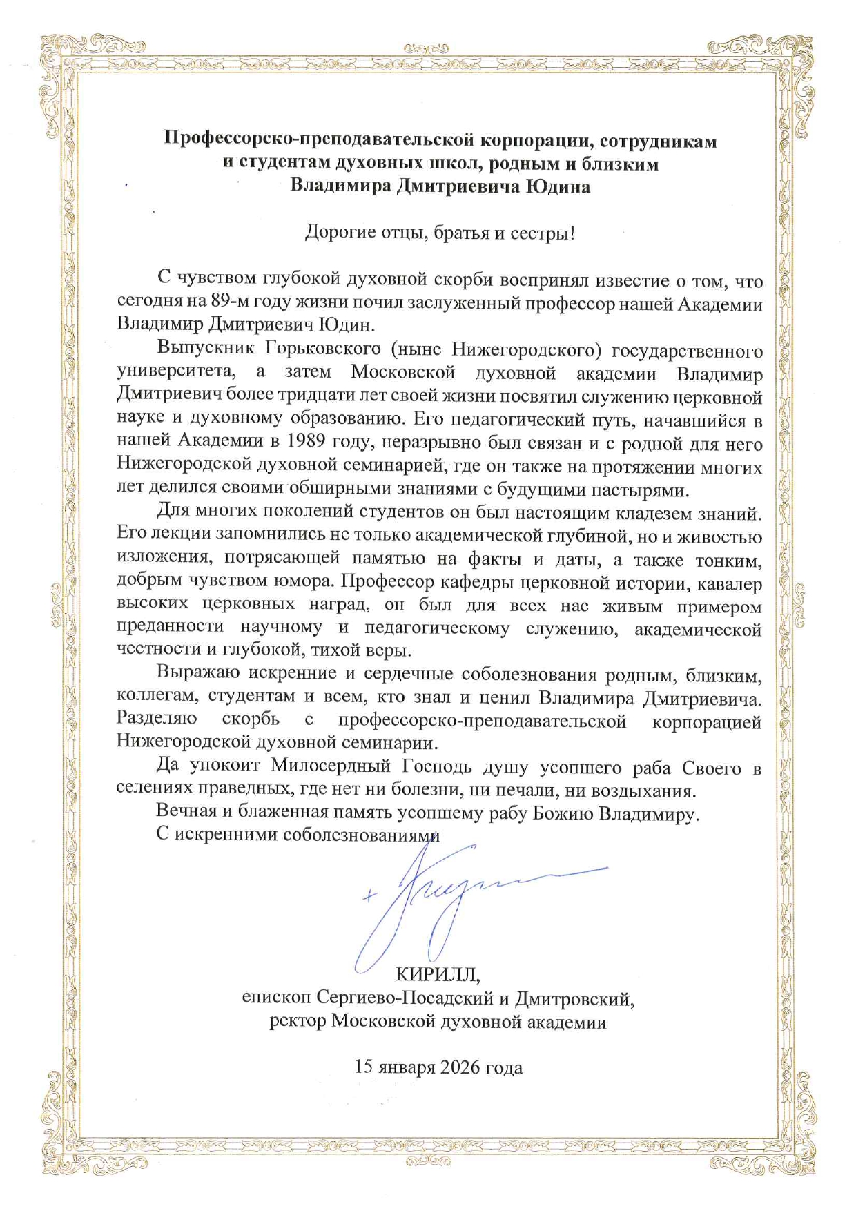 Владимир Дмитриевич Юдин, много десятилетий преподававший в Московской духовной академии и Нижегородской духовной семинарии историю России, историю Русской Православной Церкви и общую церковную историю, скончался 15 января 2026 года на 89-м году жизни после продолжительной болезни. О его жизненном и педагогическом пути читайте в некрологе портала «Богослов.RU».