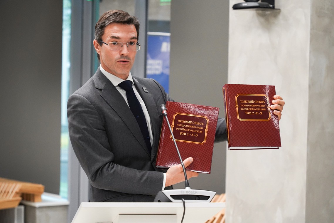 По второму вопросу декан юридического факультета, руководитель Института проблем государственного языка СПбГУ С.А. Белов представил результаты работы университета над «Толковым словарем государственного языка Российской Федерации», утвержденным Правительством РФ 30 апреля 2025 года как нормативный. Он отметил, что первая часть издания включает формулировки традиционных духовно-нравственных ценностей.
